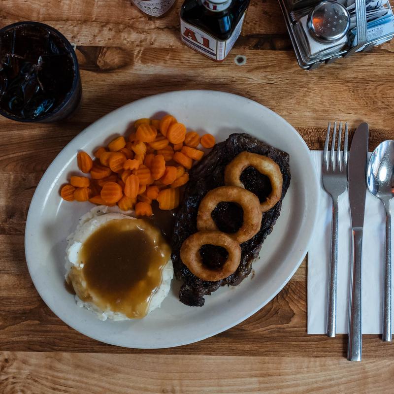 Grilled and served with rich brown gravy and three onion rings. Comes with potato, soup, and salad.